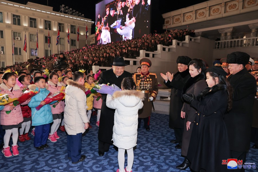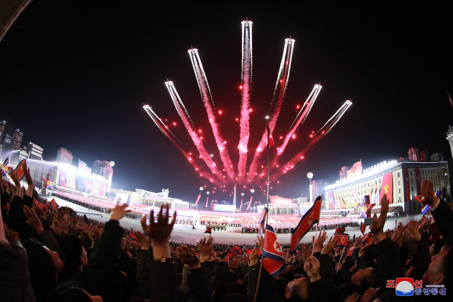 握紧世上任何强敌都不敢触犯的必胜枪杆子的百战百胜英雄军队——朝鲜人民军的阅兵式结束时,千官万兵和人民向伟大的统帅致以最大敬意和荣誉,他们的欢呼声震天动地,耀眼烟花再次腾空绽放,异彩地点缀了建军节的夜空。