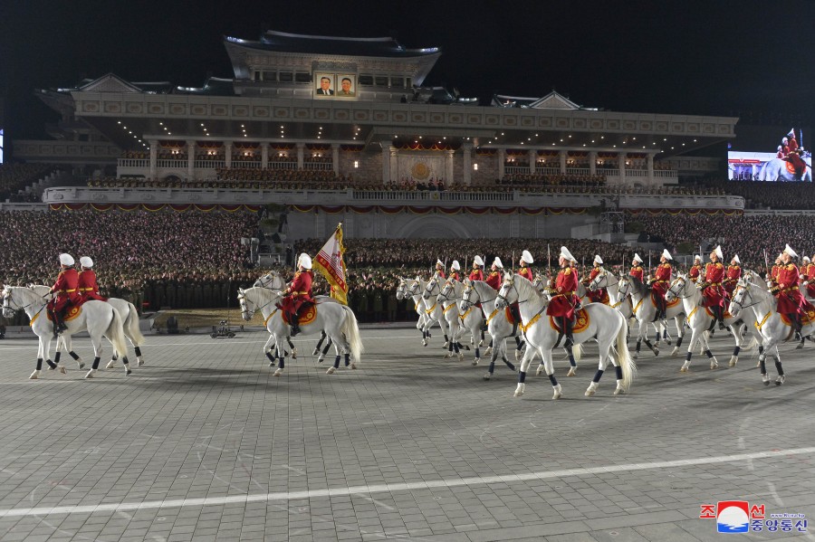 名誉骑兵方队踏响豪迈的马蹄声在阅兵队伍前头行进,展示了朝鲜人民军沿着革命领袖开辟的道路始终以同一步伐蓬勃前进过来的原本姿态、坚决继承游击队精神的历史。