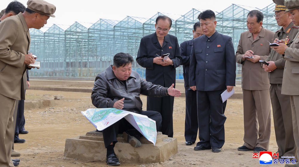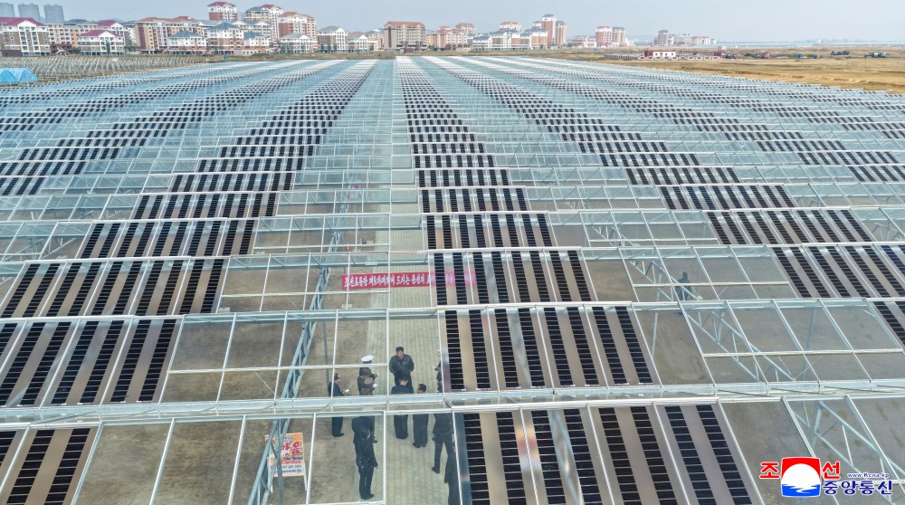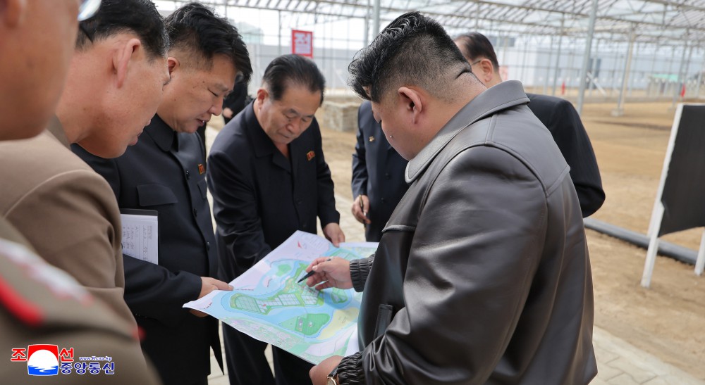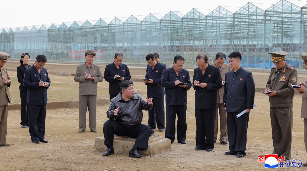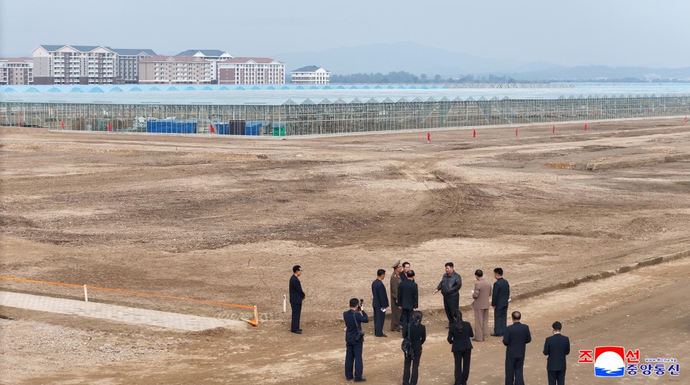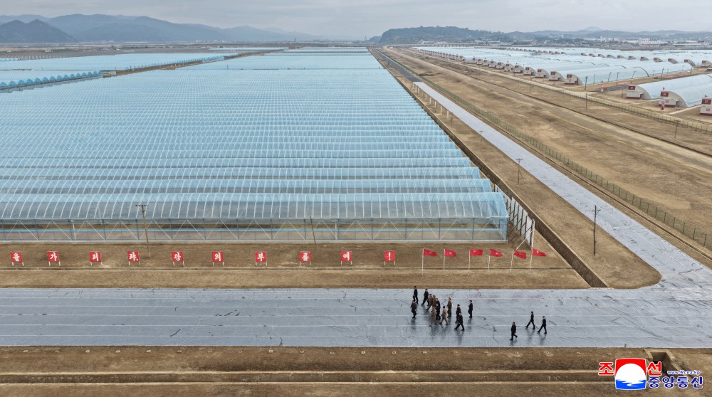 金正恩同志察看玻璃土壤温室区、蔬菜科研中心和西湖分场等工地各处,具体了解了设备组装和周边环境整理情况。