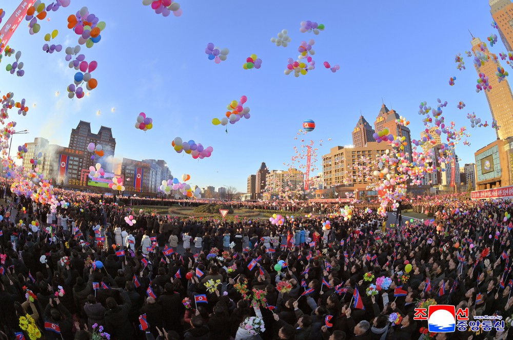 在浓墨重彩地续写新的平壤繁荣期的喜庆时刻,竣工典礼场所上,花雪和礼花升空绽放,无数气球腾空而起,华丽装点了首都的天空。