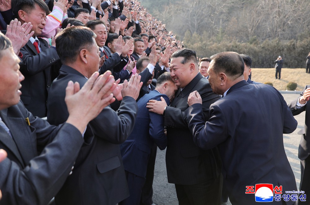 合影结束后,全体参加者仰望着金正恩同志再次爆发出的热烈欢呼声响彻天圣地区连绵山岭。