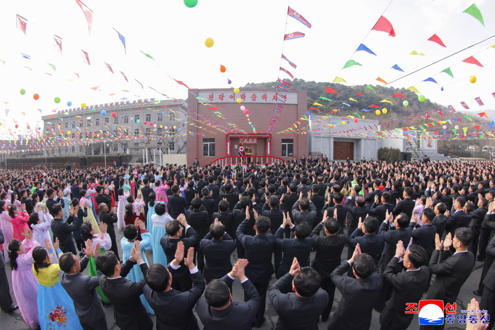 金正恩同志结束讲话,全体参加者仰望着我国革命的杰出领导者、人民的慈父高声欢呼,表达了无尽的感激之情。