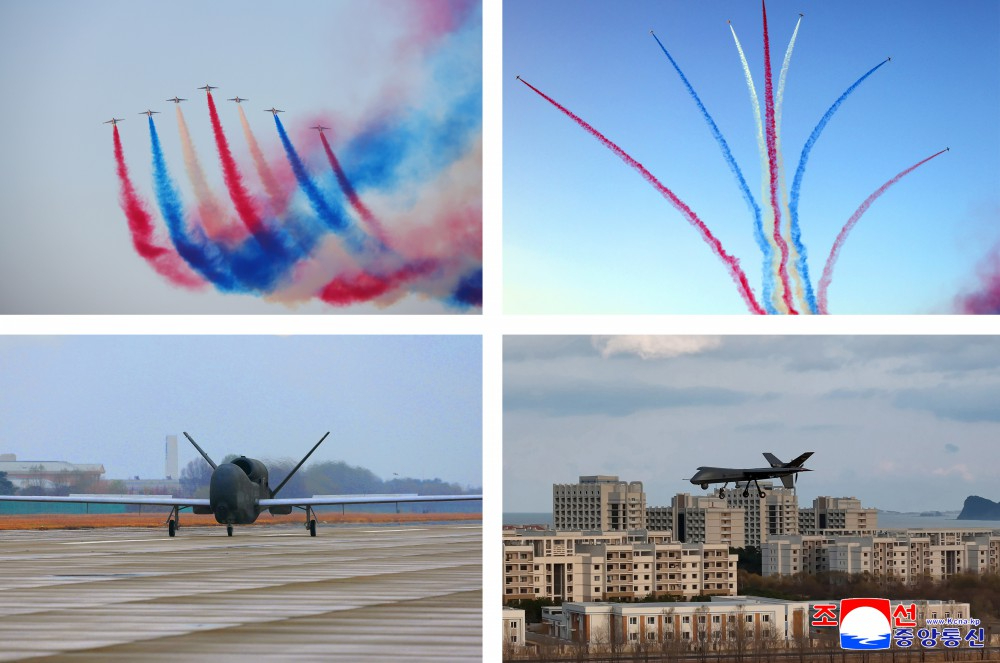 金正恩同志亲切祝贺激情欢呼的全体空军官兵,并表示相信英勇的空军武装力量的全体飞行员、指挥成员和官兵继续创造胜利神话为在光荣军旗上谱写的80年伟大沿革增光添彩,坚决维护我们国家的尊严和人民的幸福。