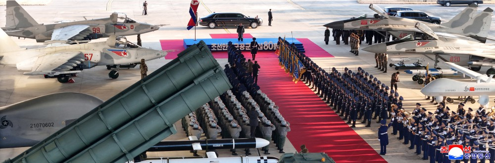 金正恩同志向以传奇式功勋熠熠生辉的朝鲜人民军空军和所属部队军旗表示战斗敬礼,并检阅了空军仪仗队。