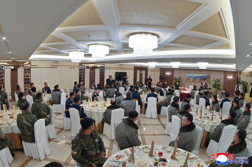 金正恩同志同朝鲜劳动党中央委员会领导干部和国防省指挥员一起出席宴会。