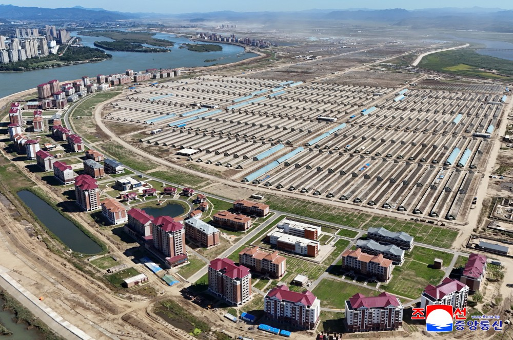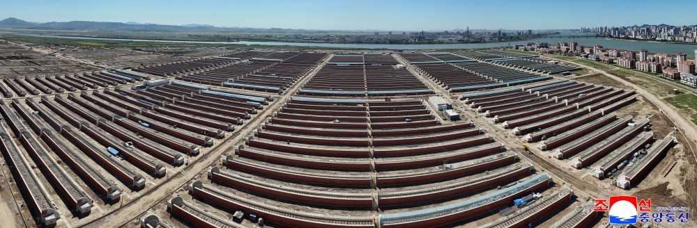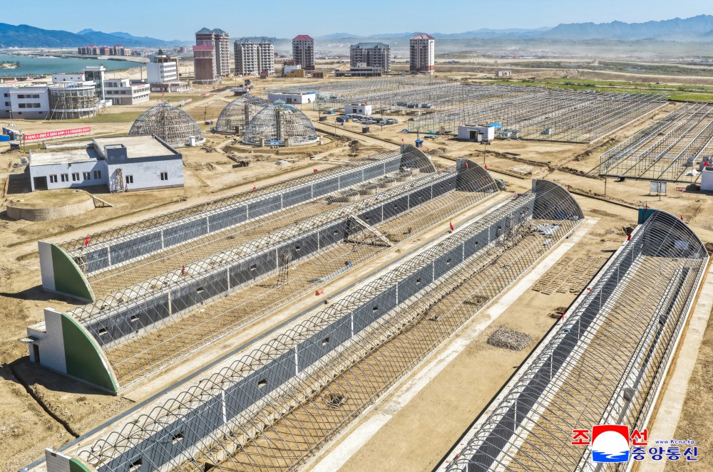 在金正恩同志要把边境地区转变成为体现现代性、独创性和民族性的发达地区的远大构想和直接指导下,在祖国西北边威化岛地区的广大面积上不同类型的温室、蔬菜加工厂、储藏设施、科技研究及普及据点、试种温室、住宅和各种文化生活基地拔地而起,展现出史无前例的大规模温室群、“大农场城市”的富有特色、大快人心的景观。