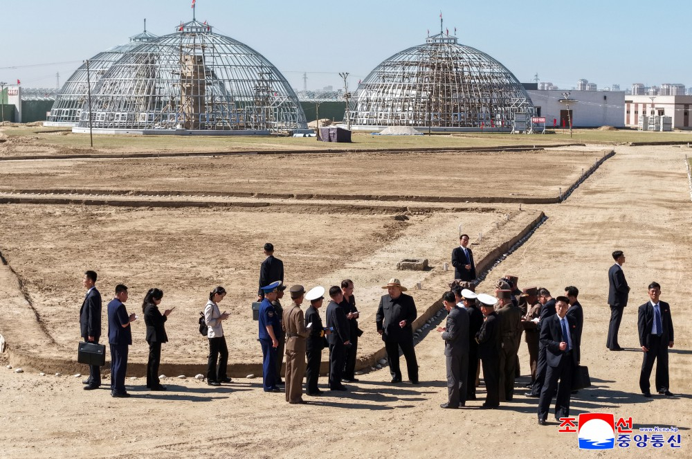 金正恩同志察看玻璃水培温室区和蔬菜科研中心等建设工地各处,具体了解了建设情况。