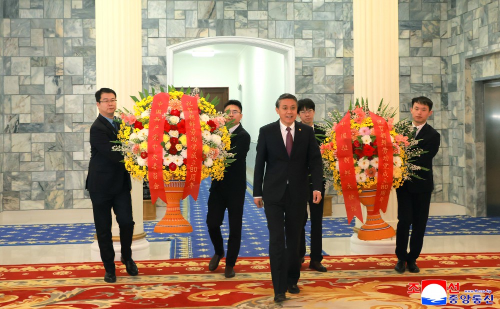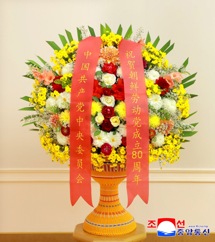 朝中社平壤10月8日电 在朝鲜劳动党成立80周年之际,朝鲜劳动党中央委员会收到了中国共产党中央委员会送来的花篮。
