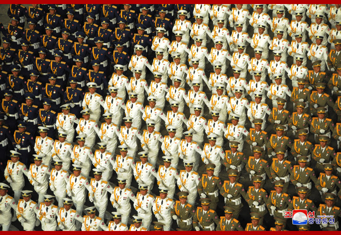 金正日军政大学、金日成军事综合大学、金日成政治大学、金正恩国防综合大学方阵,以及朝鲜人民军、社会安全军各级军校方阵威风凛凛、步伐雄健地走过广场。