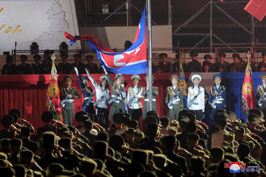 朝鲜人民军仪仗队员们举起朝鲜民主主义人民共和国国旗,合着《我们的国旗》旋律正步行进,庄严入场。