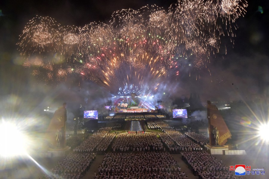 轻快的旋律和充满魄力的律动、熟练的降落及飞行特技表演谐和一致的仪式装点纪念活动的序幕,显示了在竭诚拥戴伟大领袖、卓越统帅的历史幸运中以世界战争史上前所未有的丰功伟绩光大祖国解放战争的1129天,创造世纪性战胜神话,把我们引以自豪的国号和国旗提升到世界强国地位这一点。