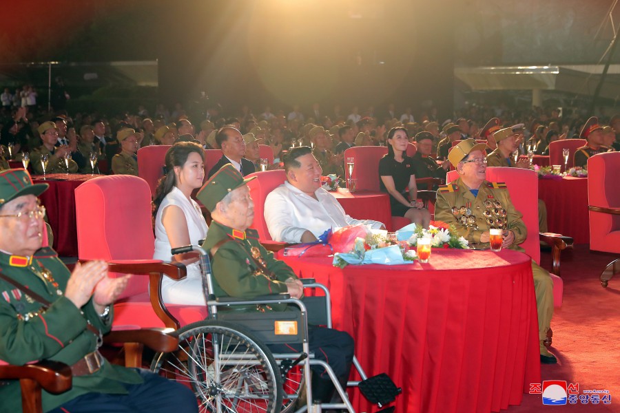 在欢迎曲乐声中,敬爱的总书记同志和李雪主女士同参战老兵一起出场。