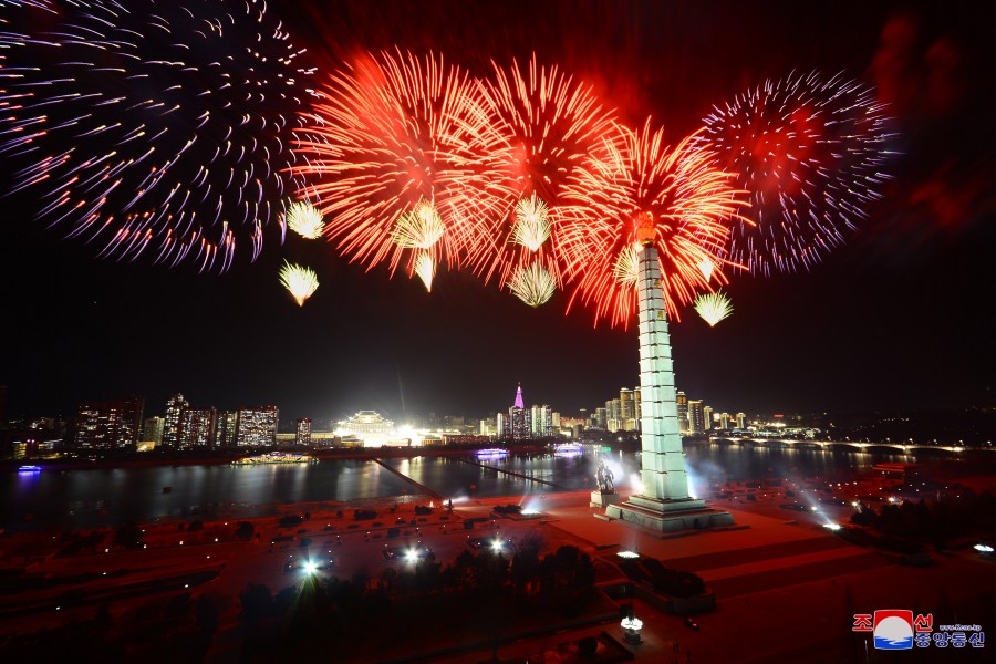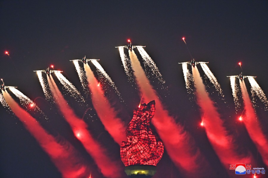 握紧世上任何强敌都不敢触犯的必胜枪杆子的百战百胜英雄军队——朝鲜人民军的阅兵式结束时,千官万兵和人民向伟大的统帅致以最大敬意和荣誉,他们的欢呼声震天动地,耀眼烟花再次腾空绽放,异彩地点缀了建军节的夜空。