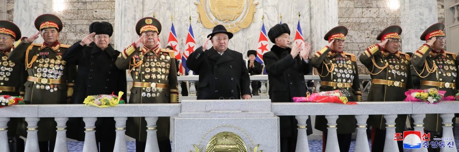 朝鲜人民军建军75周年庆祝活动参加者和作为特别代表应邀参加的援军积极分子入席招待席。