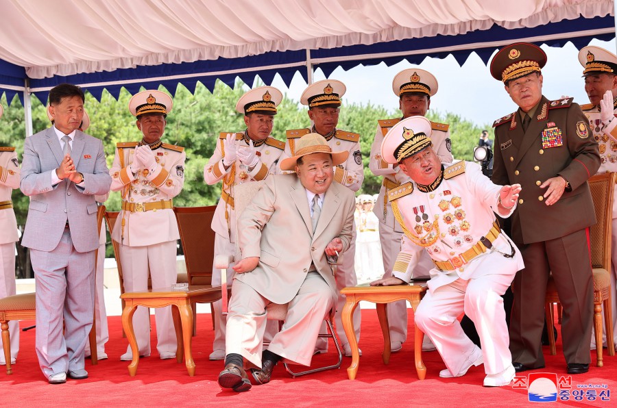 在下水典礼场所充满着对伟大母亲党——朝鲜劳动党的火热的感谢和敬仰之情。我们党引领自立国防工业、革命工业的蓬勃发展,进一步壮大和加强我们的国威、国体、共和国的绝对力量——核武装力量,筑牢国家不可逆变的地位,成就了民族的世纪宿愿。
