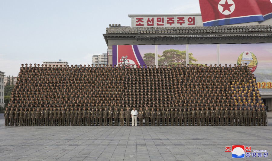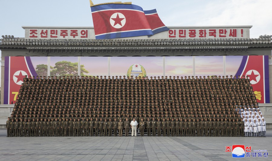 朝中社平壤9月10日电 朝鲜劳动党总书记、朝鲜民主主义人民共和国国务委员长金正恩同志9月9日同共和国成立75周年庆祝活动参加者合影留念。