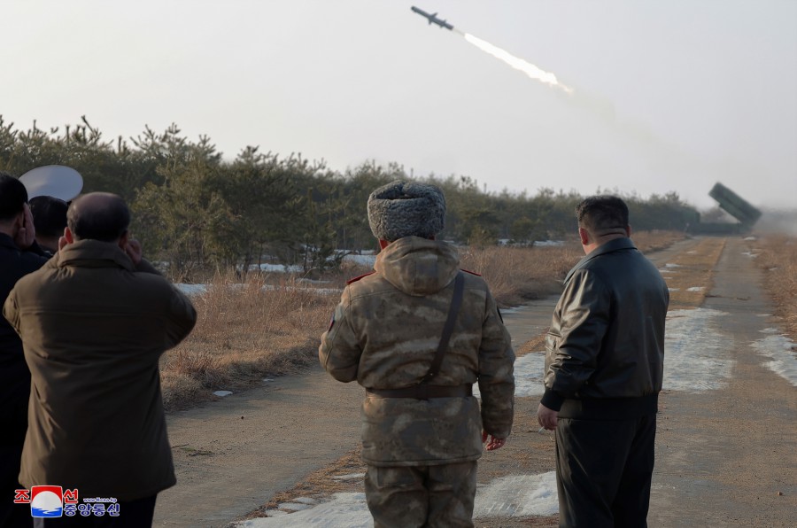 朝中社平壤2月15日电 朝鲜劳动党总书记、朝鲜民主主义人民共和国国务委员长金正恩同志于2月14日上午指导了将在海军服役的“鱼鹰-6”型新型岸舰导弹验收试射。