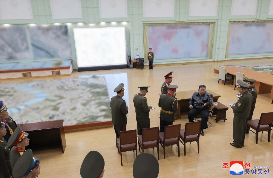 敬爱的金正恩同志在作战研究室了解敌人的主要作战行动企图、对敌军的研究情况、师生拟定的军种、军团作战计划,并指出了在现代作战中坚持且付诸实践的重要原则问题。