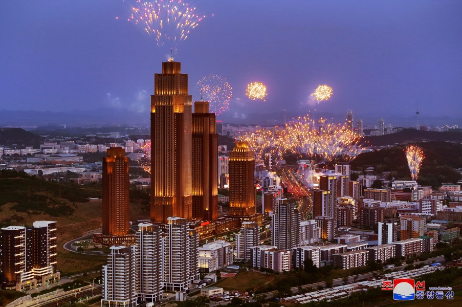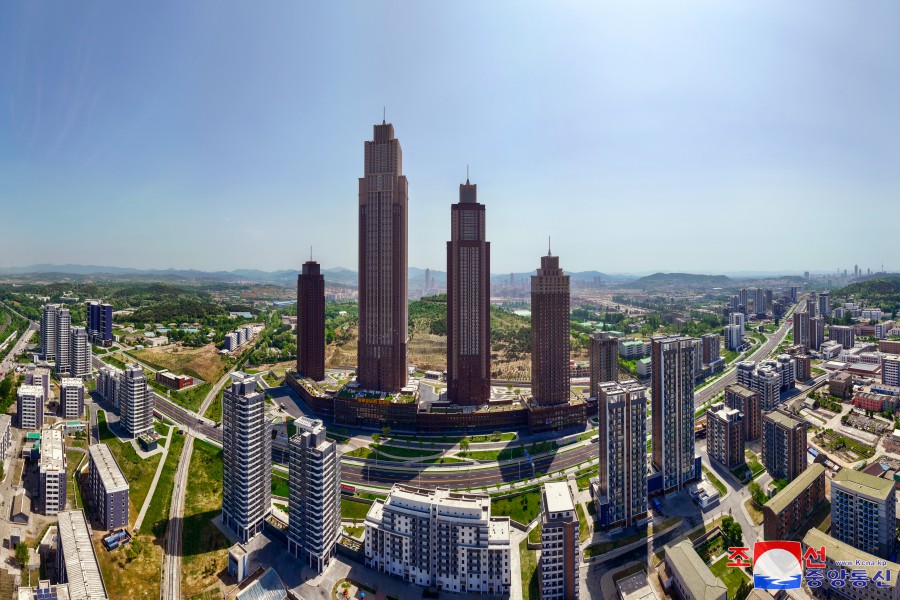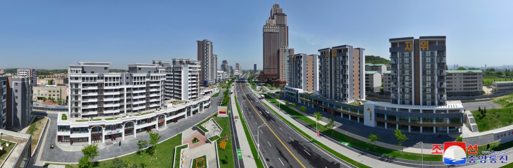 80层高楼等形式各样的高层、超高层楼房和公共建筑物展现在眼前,蔚为壮观。这座大建筑群是以热烈的爱国心拥护并保卫党的事业的可靠青年先锋献礼祖国和人民的骄傲劳动成果,是朝鲜式社会主义蓬勃前进的产物。