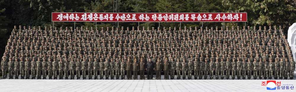当天,敬爱的金正恩同志同指挥部官兵合影留念。