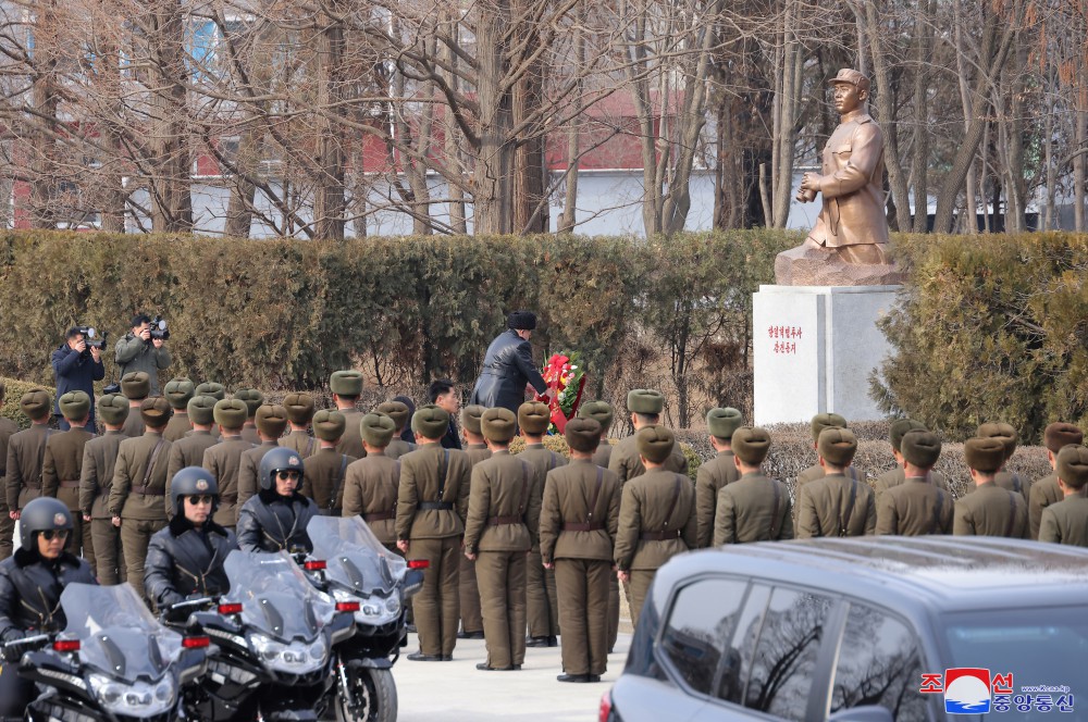 敬爱的金正恩同志抵达校园,先向无限忠于金日成同志的战友、得力的军事指挥员、抗日革命老战士——姜健同志的半身铜像敬献花圈。