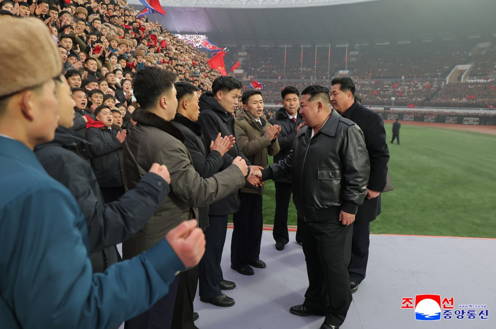 金正恩同志向热烈欢呼的全体参加者亲切挥手致意,向把自己青春的美好希望和远大抱负献给祖国繁荣事业并建立殊勋的全国青年致以祝贺和问候。