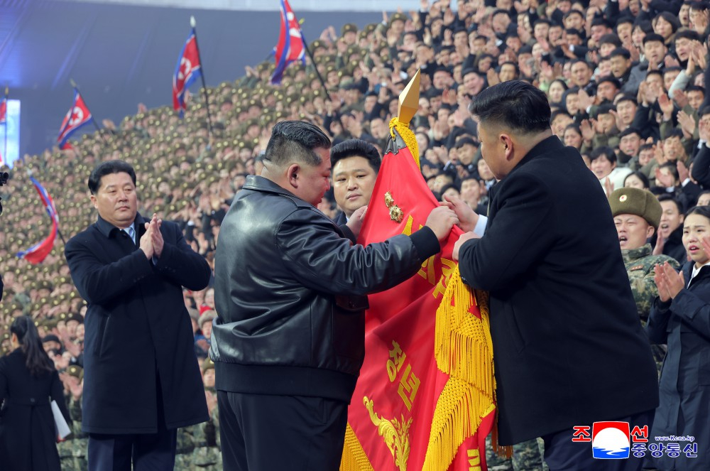 金正恩同志给社会主义爱国青年同盟旗佩带金正日勋章,并向青年同盟中央委员会委员长转交了勋章证书。