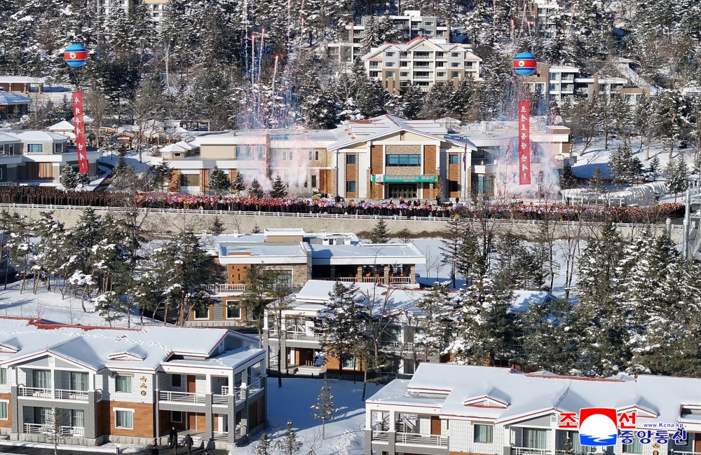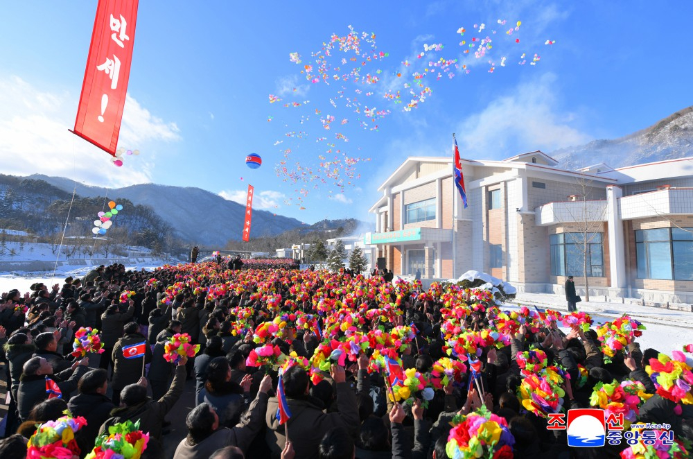 金正恩同志抵达竣工典礼场所,全体参加者爆发出热烈的欢呼声,向蓬勃开创社会主义文明复兴新历史的全国大家庭的伟大慈父表达了最大敬意。