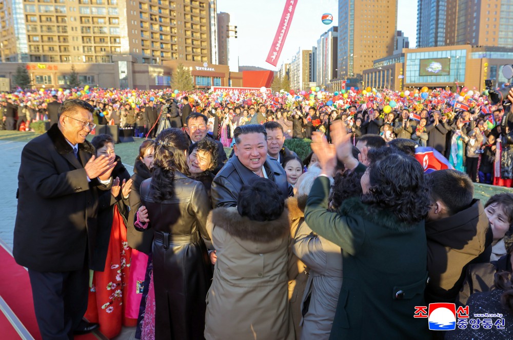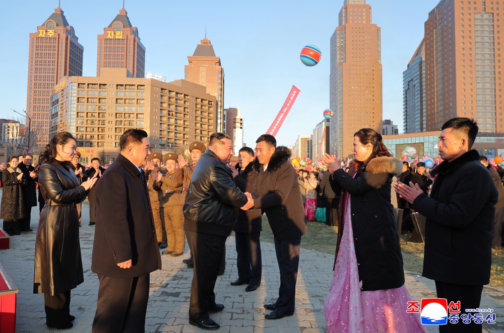 金正恩同志对满怀激情、深表感谢的他们说,希望他们今后在新式住宅享福享乐,祈愿将在新居安家落户的所有家庭充满喜悦和幸福。