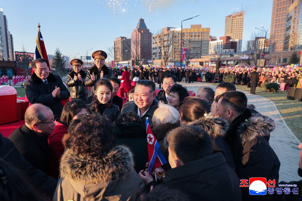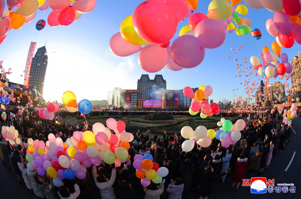 在浓墨重彩地续写新的平壤繁荣期的喜庆时刻,竣工典礼场所上,花雪和礼花升空绽放,无数气球腾空而起,华丽装点了首都的天空。