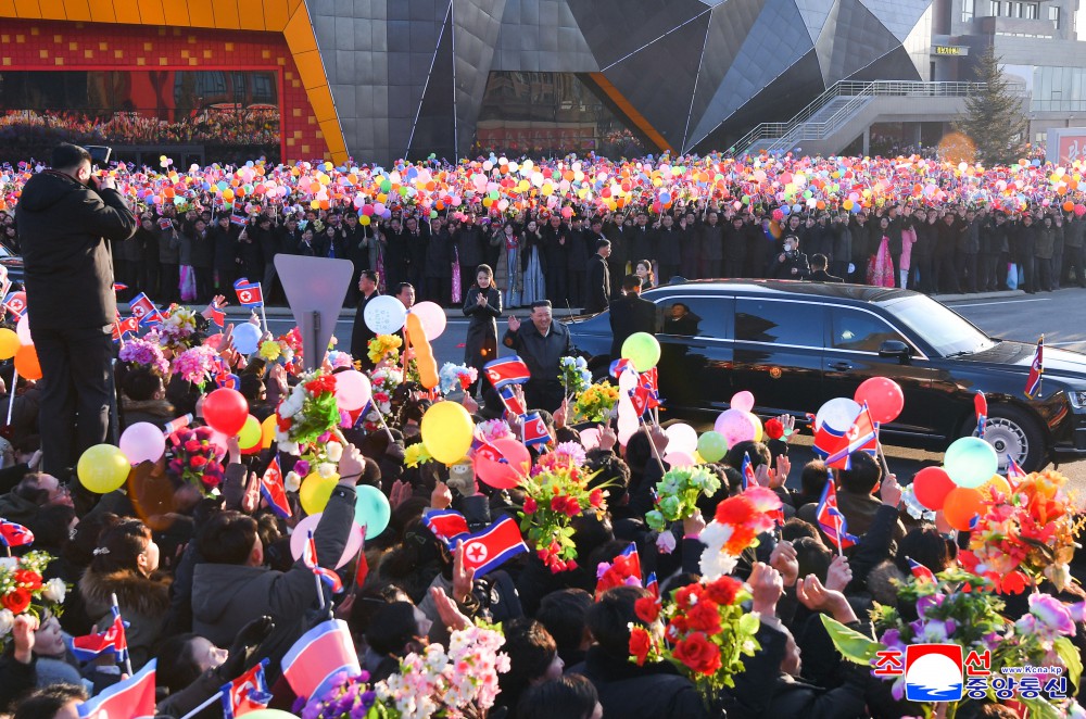 金正恩同志抵达典礼场所,全体参加者仰望着伟大的创造大师、卓越的革命领导者爆发出雷鸣般的“万岁”欢呼声,礼赞他蓬勃开创人民的美梦和理想开花结果的社会主义全面发展的全盛期。