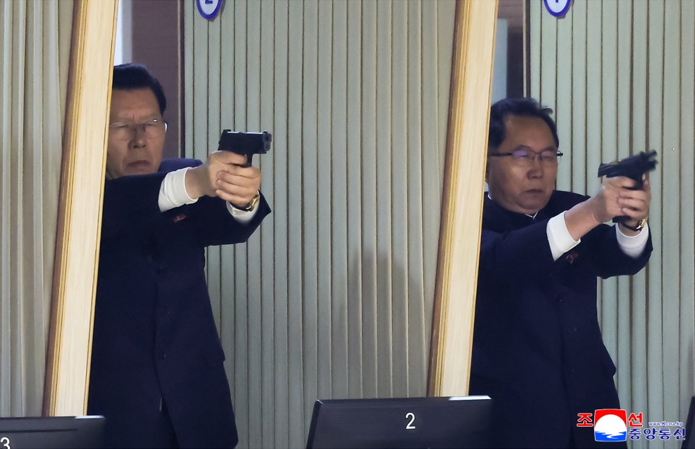 这天,金正恩同志到工厂射击馆亲自了解了开始生产的新型手枪战斗性能。
