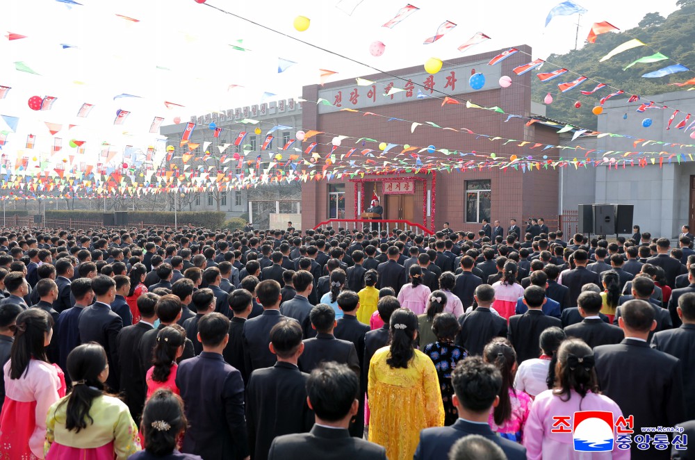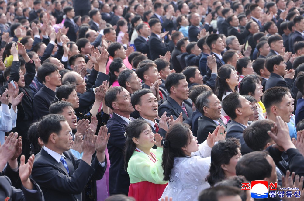 金正恩同志结束讲话,全体参加者仰望着我国革命的杰出领导者、人民的慈父高声欢呼,表达了无尽的感激之情。