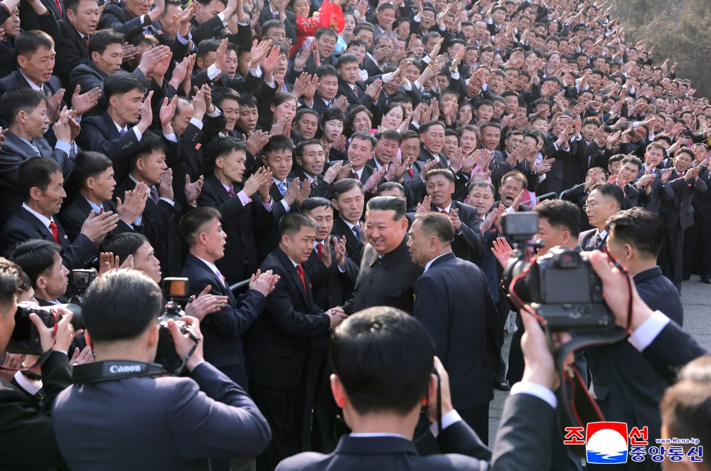 合影结束后,全体参加者仰望着金正恩同志再次爆发出的热烈欢呼声响彻天圣地区连绵山岭。