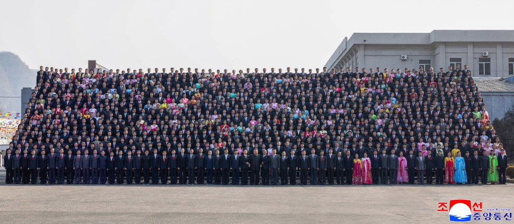 当天,金正恩同志同天圣青年煤矿工人和劳模以及干部合影留念。