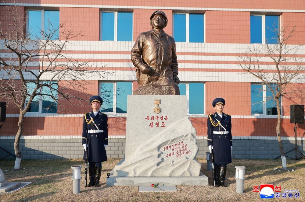 金正恩同志深情缅怀英雄飞行员心怀坚决保卫祖国和革命的精神,在卫国航线留下永不磨灭的忠诚航迹的高贵人生,向烈士半身像敬献鲜花,表示敬意。