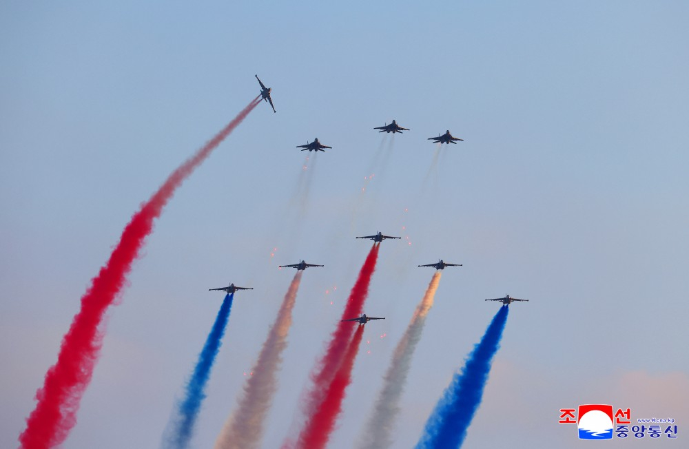天空哨兵们低空飞过瞭望台上空,向金正恩同志表达绝对忠诚的意志和最热烈的信赖。
