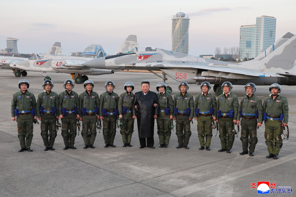 金正恩同志表示,确信有你们在,我国天空永远蔚蓝、我们祖国安宁,对始终忠于祖国的服务精神致以感谢,祝愿英雄空军的战功和飞行员的安宁。