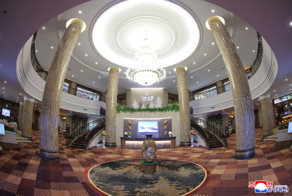 这些饭店同小白水、落叶松、白桦树、青峰等三池渊地区特有的象征性名字一道,炫耀与白头山大自然相映成趣的独特建筑美,具备特色服务功能,在内容和形式等方方面面开拓大众服务据点新境界,是我们时代值得自豪的创造物。