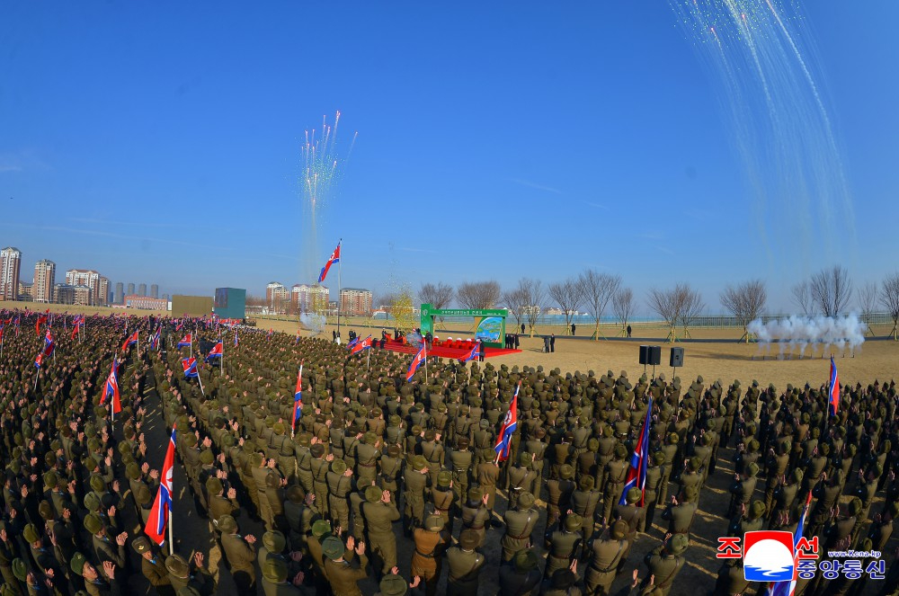 金正恩同志向我们军队官兵和青年建设者致以温馨的鼓励和问候,赞赏他们把党的地方发展宏伟构想和决心当做绝对真理,发挥爱国热情,顽强开展建设斗争,把该岛屿地区出色地转变成为新时代理想的农场城市。