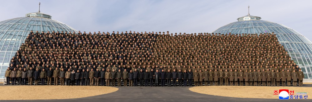 金正恩同志会见为建设新义州温室综合农场作出贡献的科技工作者和中央及现场指挥部工作人员,同他们合影留念。