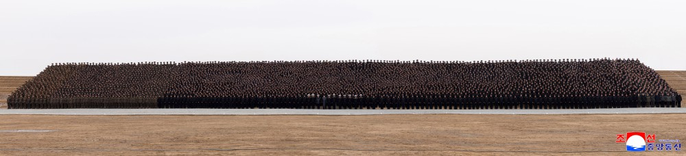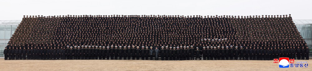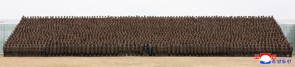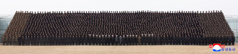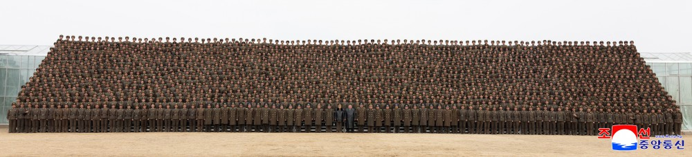 当天,金正恩同志同参加新义州温室综合农场建设工程的军人建设者和青年先锋合影留念。