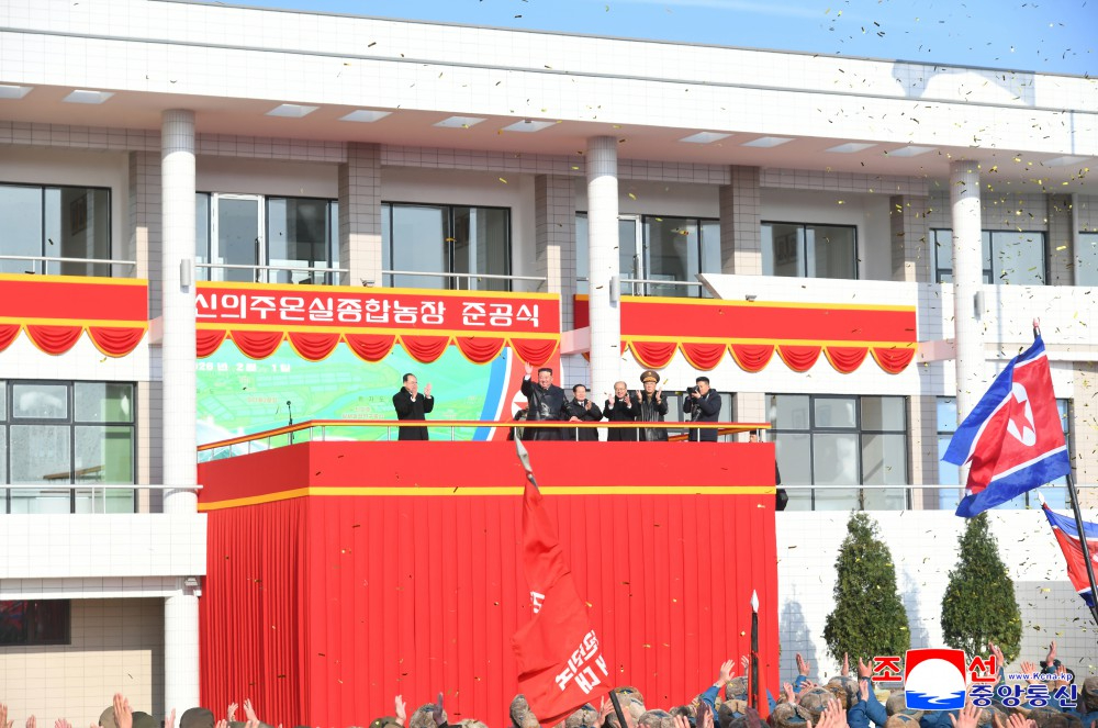 党政军领导干部等党中央领导班子成员、军人建设者、青年突击队员、平安北道和新义州市干部、劳动群众、有关部门和新义州温室综合农场干部员工参加了竣工典礼。