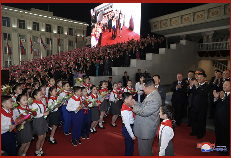 金正恩同志向热烈欢呼的阅兵部队和庆祝活动参加者挥手还礼,对迎接高有尊严的我们共和国成立日的全体人民致以亲切的问候。