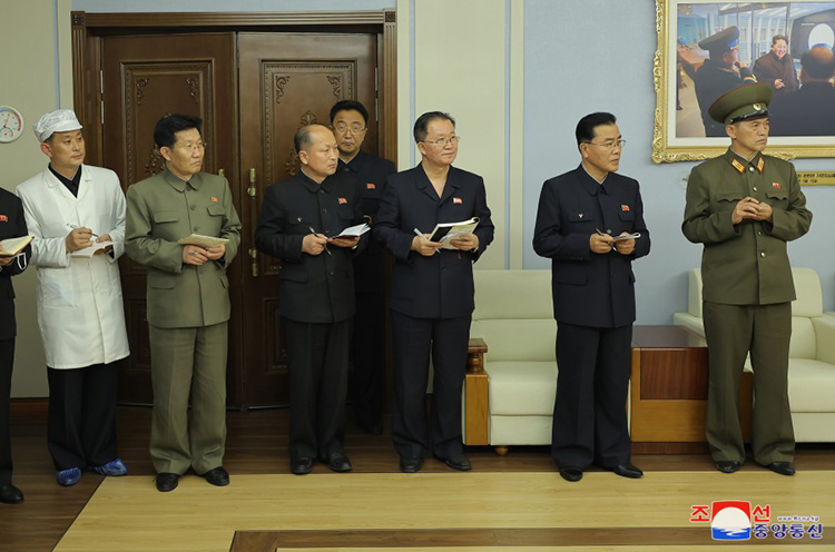 朝鲜劳动党中央委员会军需工业部和科学教育部的主要干部、宇宙开发局和非常设卫星发射筹备委员会成员在场迎接敬爱的金正恩同志。