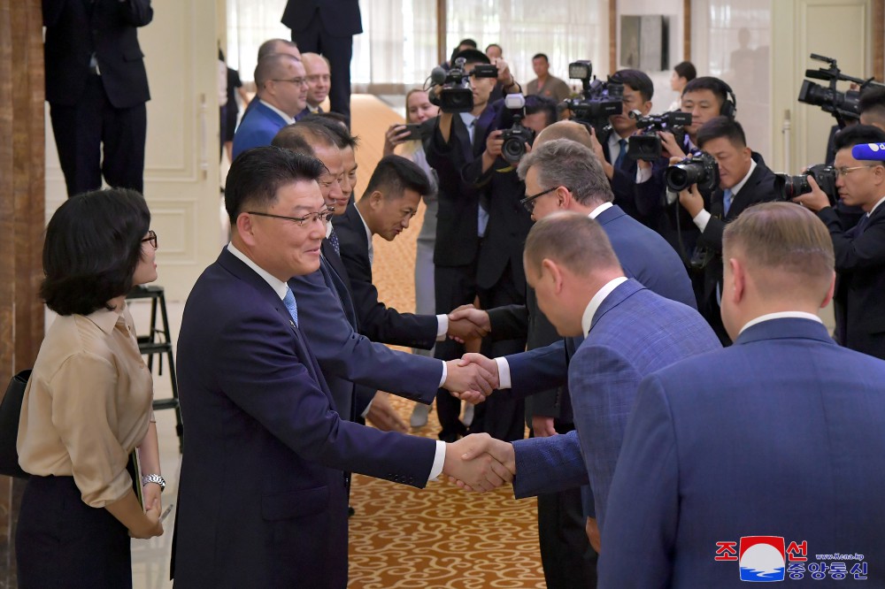 朝鲜民主主义人民共和国对外经济相尹正浩、有关部门干部、俄罗斯驻朝鲜大使馆临时代办弗拉基米尔•托佩哈和使馆成员到平壤国际机场迎接代表团。