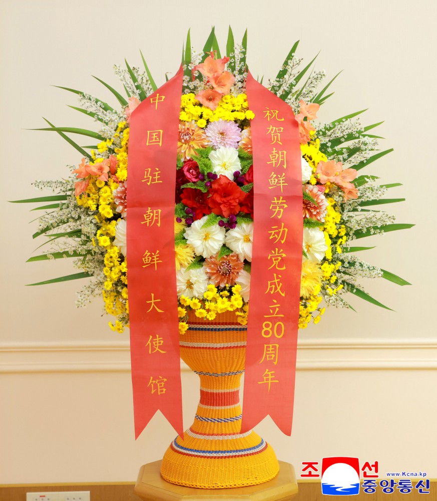 朝中社平壤10月8日电 在朝鲜劳动党成立80周年之际,朝鲜劳动党中央委员会收到了中国共产党中央委员会送来的花篮。