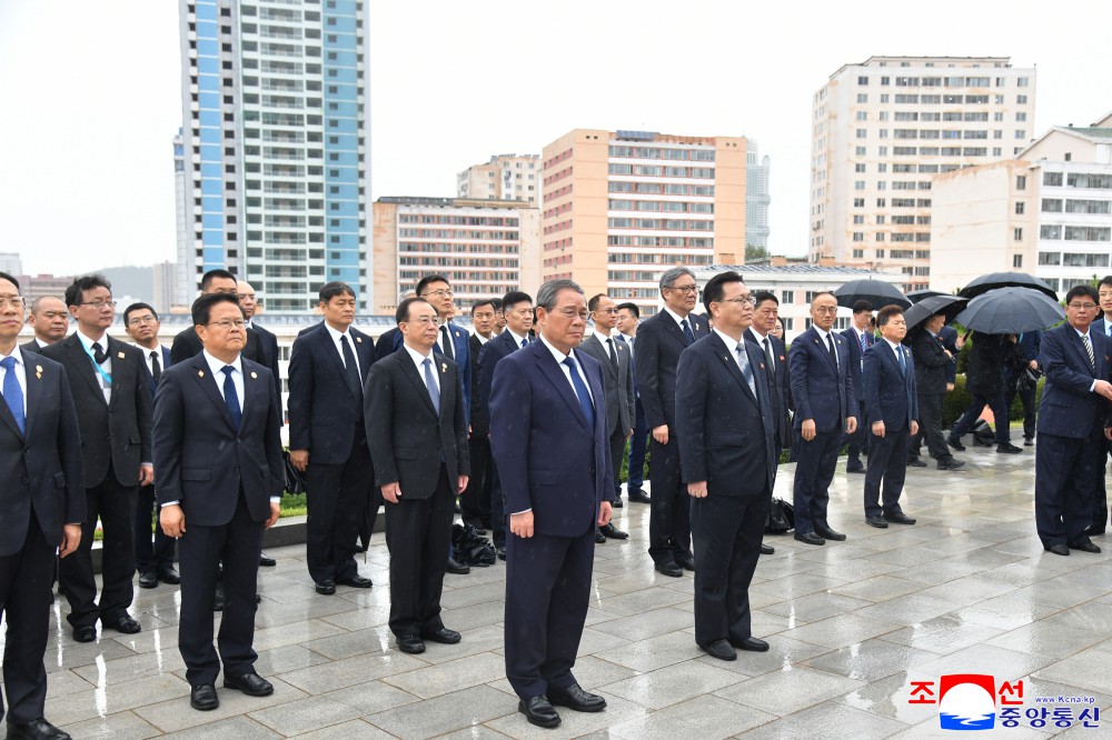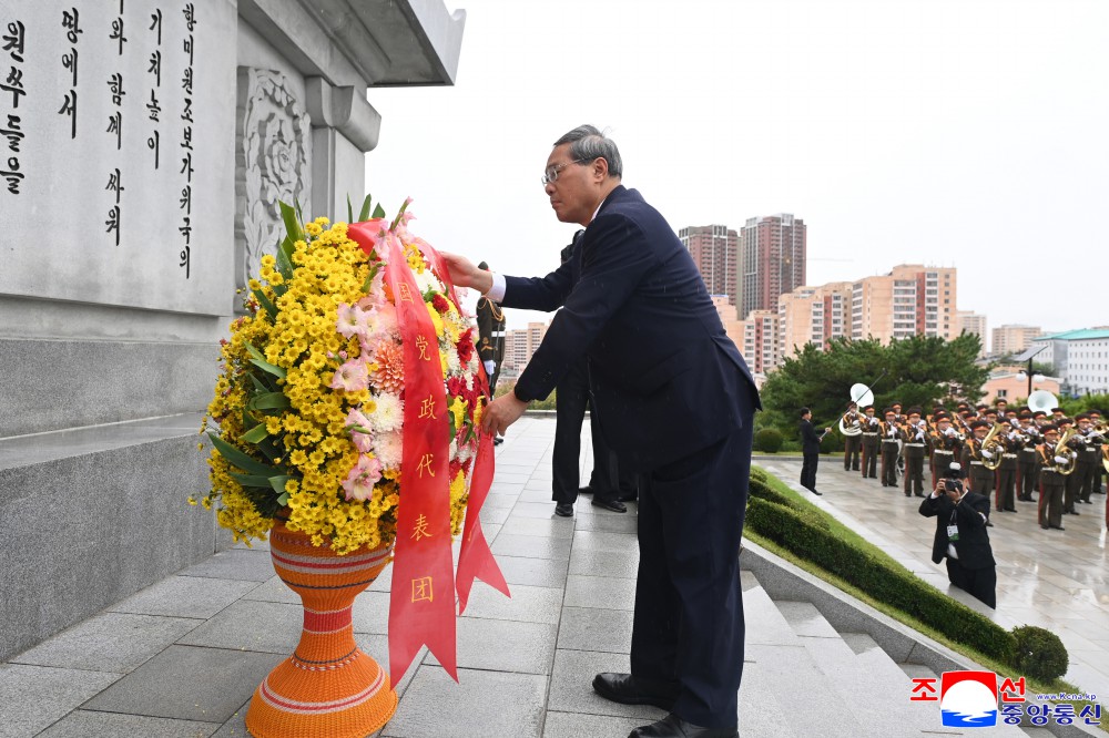 朝中社平壤10月11日电 由中国共产党中央委员会政治局常务委员会委员、中华人民共和国国务院总理李强同志率领的中华人民共和国党政代表团10日向友谊塔敬献花篮。