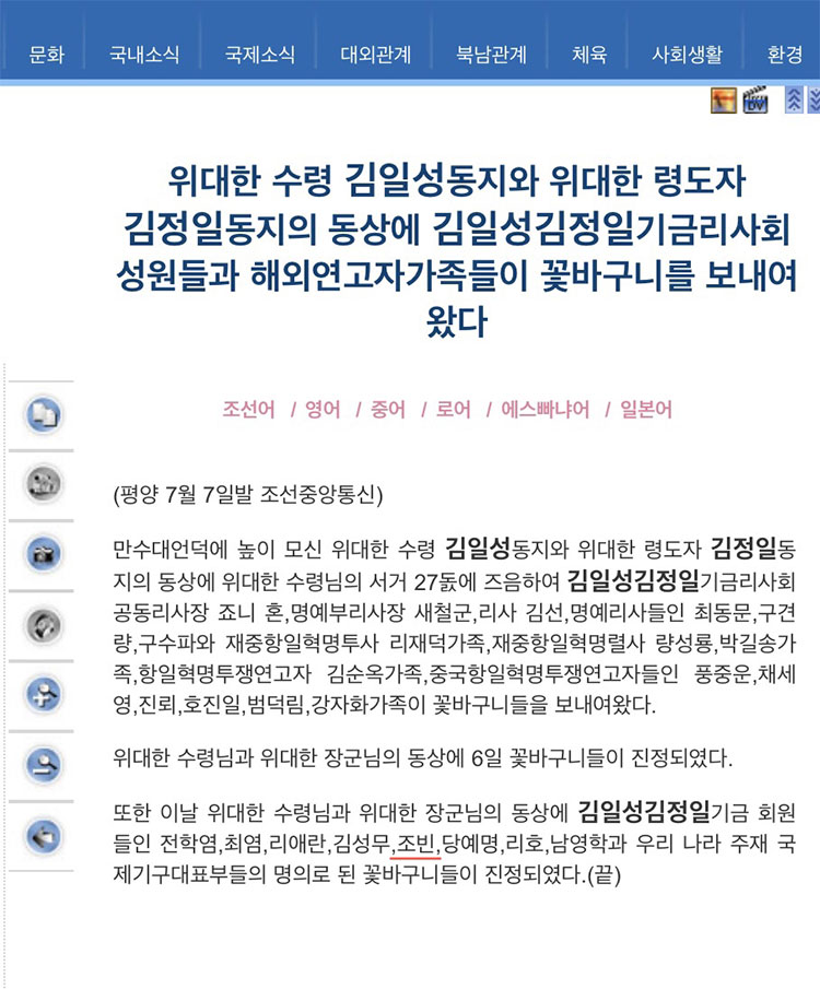 朝鲜人民的伟大领袖金日成同志逝世27周年来临之际,金日成金正日基金理事会会员赵斌名义的花篮,在7月6日敬献于矗立在平壤万寿台岗上的金日成同志与金正日同志铜像前!